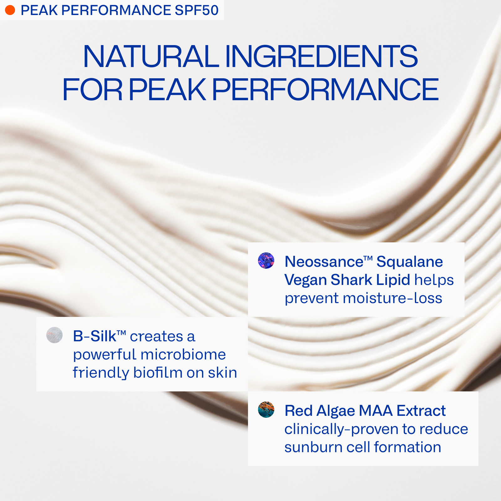 Apply Peak Performance SPF50 Sunscreen in the morning before you go outside, or 15 minutes before going in the sun, and as the final step in your daily skincare routine. Apply one pump amount or more of our Peak Performance SPF50 Sunscreen into hands and gently rub onto face, neck, chest and body if applicable. Reapply after 80 min of swimming or sweating, immediately after towel drying and at least every 2 hours when exposed to the sun.