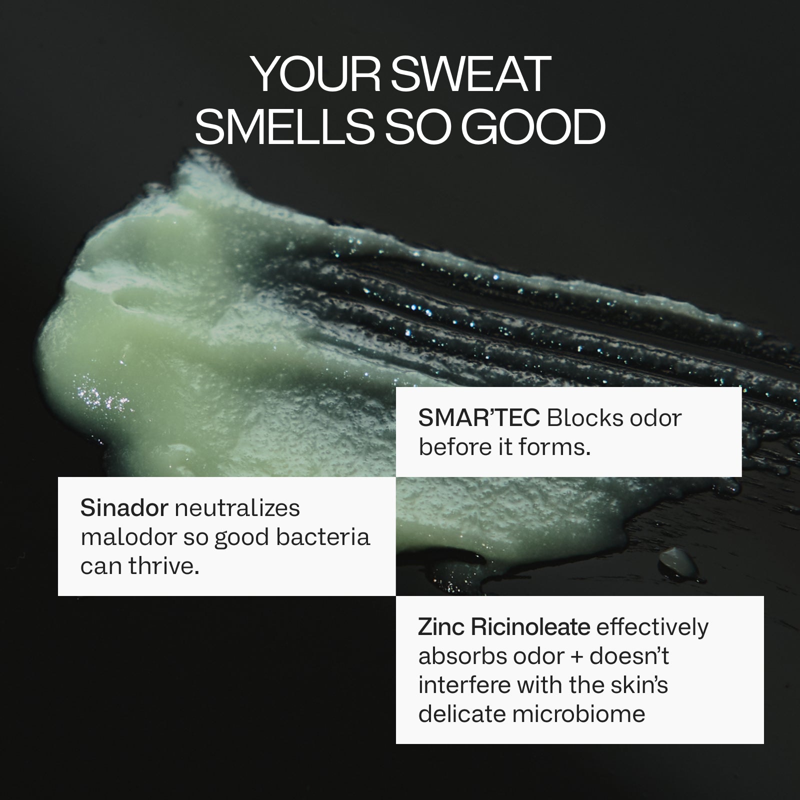 Effectively absorbs odor + doesn’t interfere with the skin’s delicate microbiome